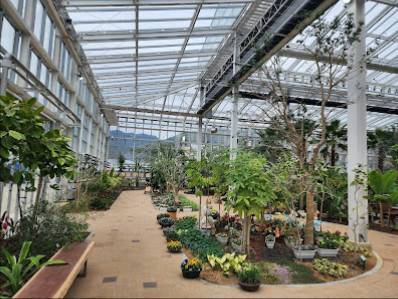 さらに、センターには、広々とした駐車場と電気自動車充電設備も設置されています。また、施設正面側のビニールハウスでは、様々な植物が栽培されており、見学客に楽しんでもらっています。 センター内には、入居募集が11月に実施される宿泊施設や、広大な芝生と日よけ、ベンチが設置された休憩スペースも備わっています。 さらに、植物園には、多くの花が咲き誇り、訪れる人々を魅了しています。