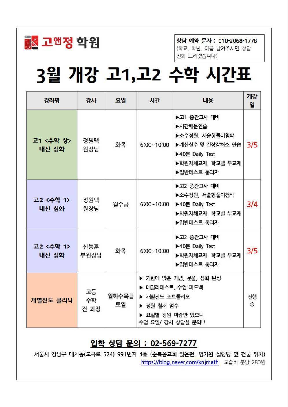주소: 대한민국 서울특별시 강남구 대치동 991번지 고앤정학원 4층.